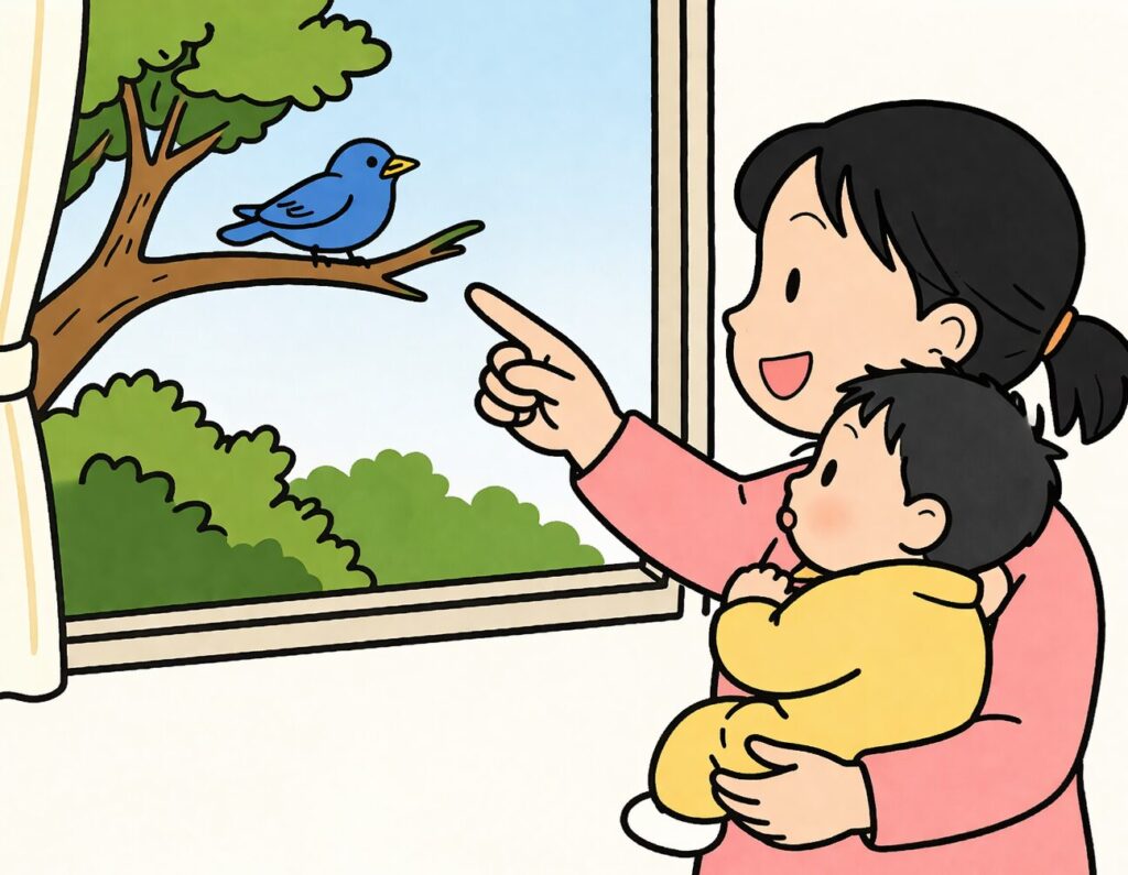 お母さんは、窓の外を指しているので、窓から見える風景について、子どもに語りかけているのは分かりますが、上記のように、語り掛けたことばの意味になることの可能性は沢山できてしまいます。